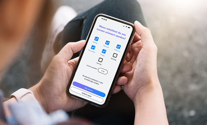 Neu sind Lernerinnerungen, die Ihre Schüler*innen individuell einstellen können. Wochentage und Uhrzeit auswählen – und schon erinnert eine Push-Nachricht ans Lernen. So bleibt die Motivation hoch, regelmäßig zu lernen und nicht wochenlang Pause zu machen.