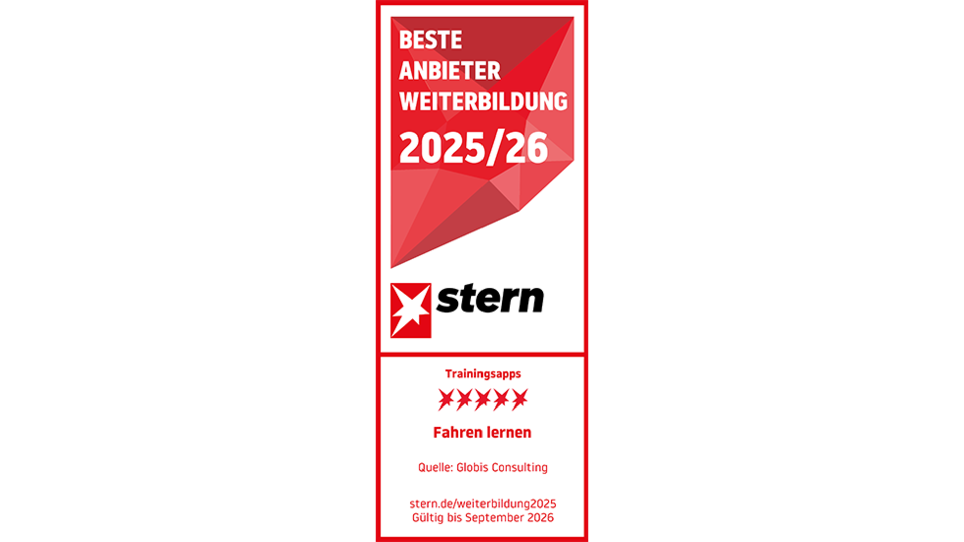 Nach Auszeichnungen als beste Lernapp in den Jahren 2023 und 2024 geht die Erfolgsserie weiter. Das Magazin Stern und der n-tv Bildungsaward haben erneut die Lernqualität, das Preis/Leistungsverhältnis und die Zufriedenheit von Trainings-Apps in der beruflichen Weiterbildung bewertet. Das Fazit: Fahren Lernen gehört zur Spitzenklasse. Das findet auch Statista, die Fahren Lernen schon im Frühjahr 2025 mit dem 1. Platz als Top Trainings-App ausgezeichnet hat.
