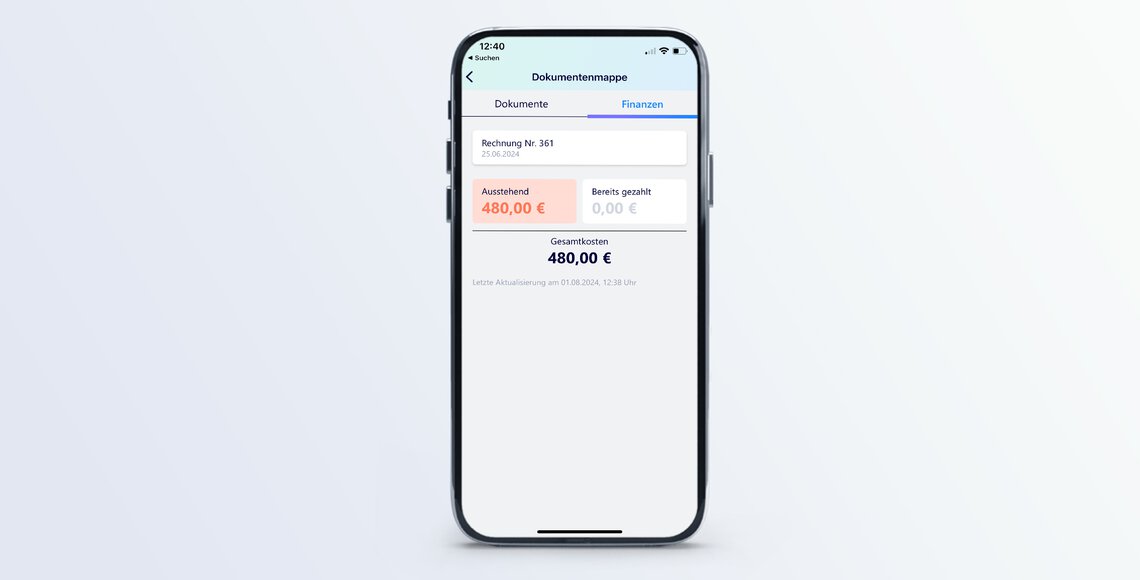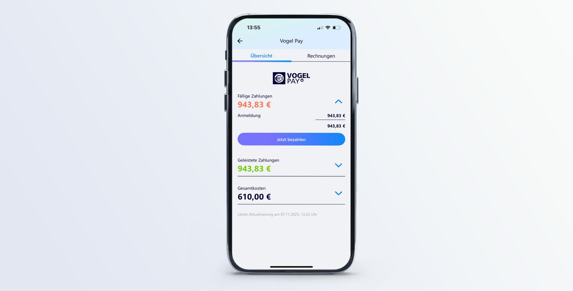 Auf der Startseite erscheint ein Hinweis mit einer Zahlungsanforderung, sobald Beträge bei Ihren Schüler*innen offen sind. Diese können bequem über die App beglichen werden.*
